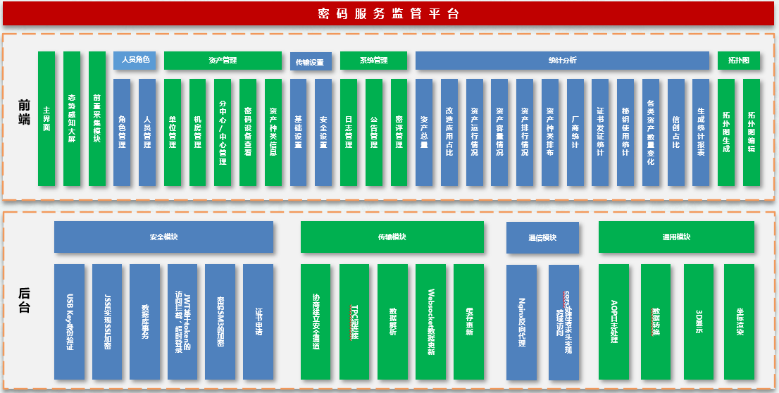 平台为软件产品,可顺利获得搭配前置采集模块自动采集底层密码设备信息,同时支持底层数据报送模式。采用B/S架构,在服务器部署成功后,客户可直接顺利获得浏览器进行访问。支持顺利获得USB Key进行登录身份认证。